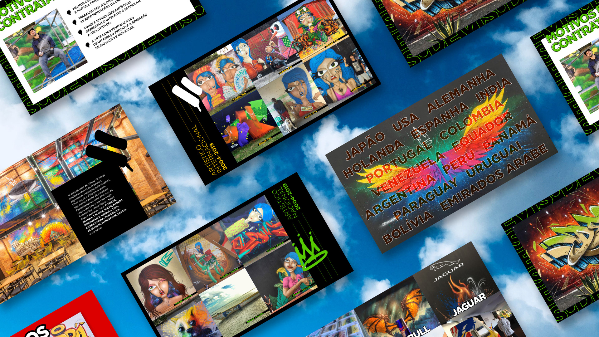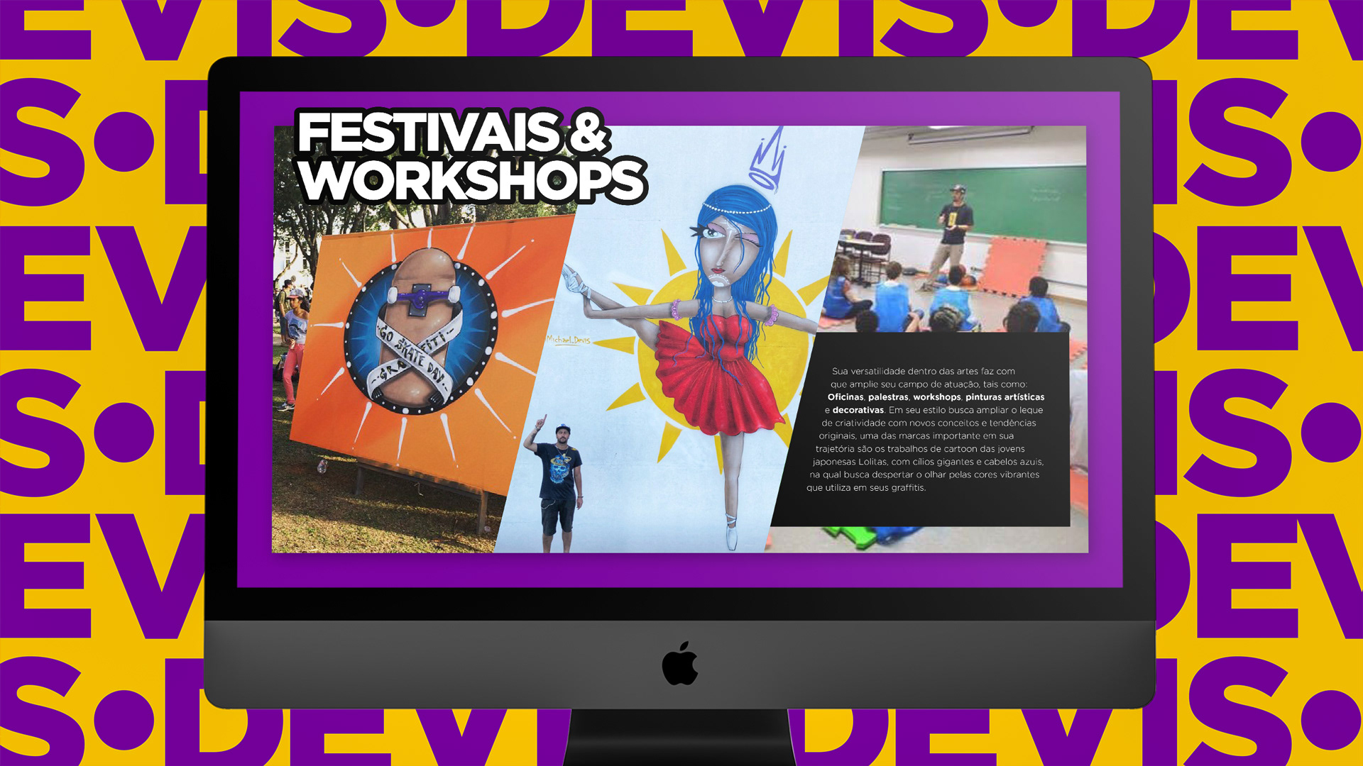 Fui convidado a criar seu portfólio digital apresentando seus trabalhos. Esbanjei das cores, com muito contraste, utilizando elementos da arte de rua, inspirado em suas incríveis ilustrações.